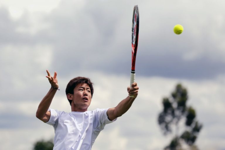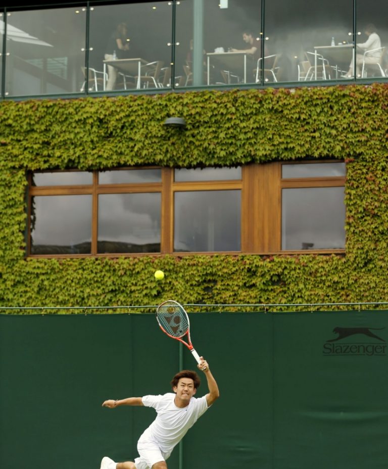 Japonský tenista Jošihito Nišioka počas zápasu prvého kola Wimbledonu, v ktorom prehral s Ukrajincom Sergijom Stachovským 3:6, 4:6, 4:6. Londýn, 27. jún 2016. Foto: SITA/AP