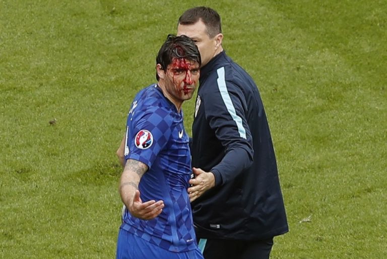 Zakrvavený chorvátsky futbalista Verdan Čorluka počas zápasu na majstrovstvách Európy. Paríž, 12. jún 2016. Foto: SITA/AP