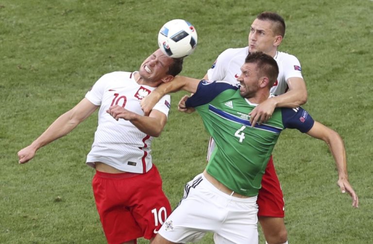 Poľskí futbalisti Grzegorz Krychowiak a Artur Jedrzejczyk v súboji s Garethom McAuley zo Sverného Írska počas zápasu na majstrovstvách Európy. Nice, 12. jún 2016. Foto: SITA/AP