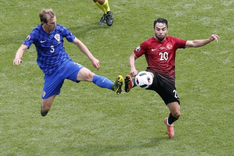 Chorvátsky futbalista Ivan Strinič v súboji s Turkom Volkanom Senom počas zápasu na majstrovstvách Európy. Paríž, 12. jún 2016. Foto: SITA/AP