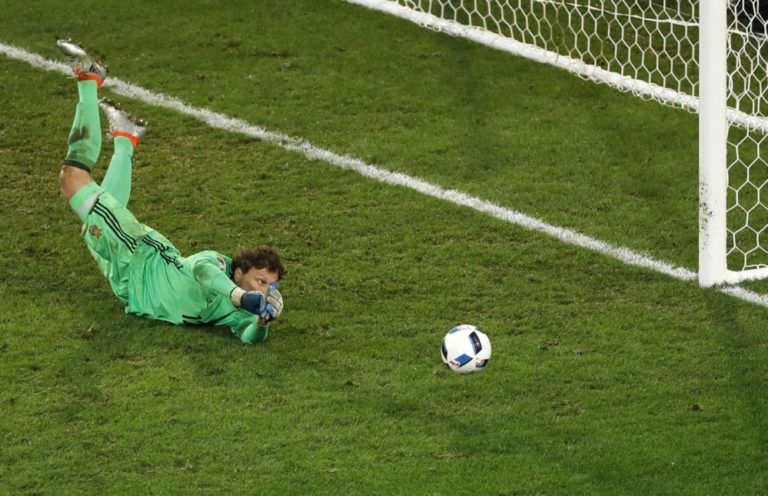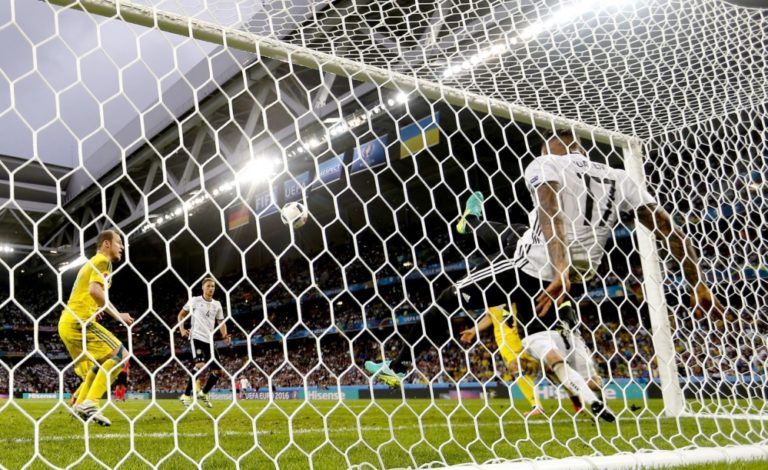 Zákrok ukrajinského brankára Andrija Piatova počas zápasu proti Nemecka na majstrovstvách Európy. Lille, 12. jún 2016. Foto: SITA/AP