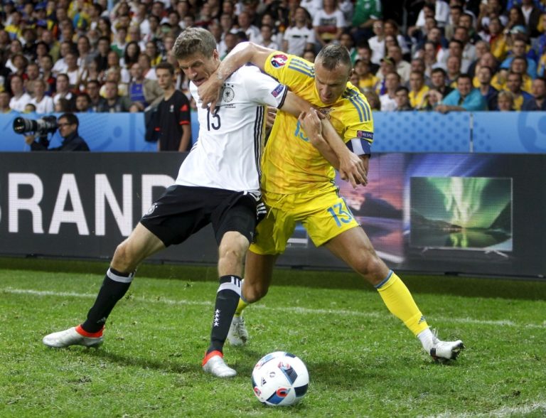 Ukrajinec Viačeslav Ševčuk v súboji s nemeckým futbalistom Thomasom Müllerom počas zápasu na majstrovstách Európy. Lille, 12. jún 2016. Foto: SITA/AP