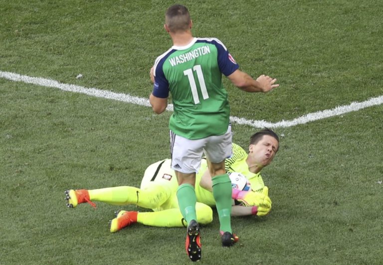 Zákrok poľského brankára Wojciecha Szczesného po zakončení Conora Washingtona zo Severného Írska počas zápasu na majstrovstvách Európy. Nice, 12. jún 2016. Foto: SITA/AP