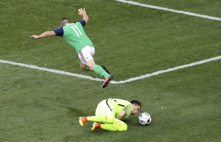 Zákrok brankára Severného Írska Michaela Mcgoverna po strele jedného z poľských futbalistov počas zápasu na majstrovstvách Európy. Nice, 12. jún 2016. Foto: SITA/AP