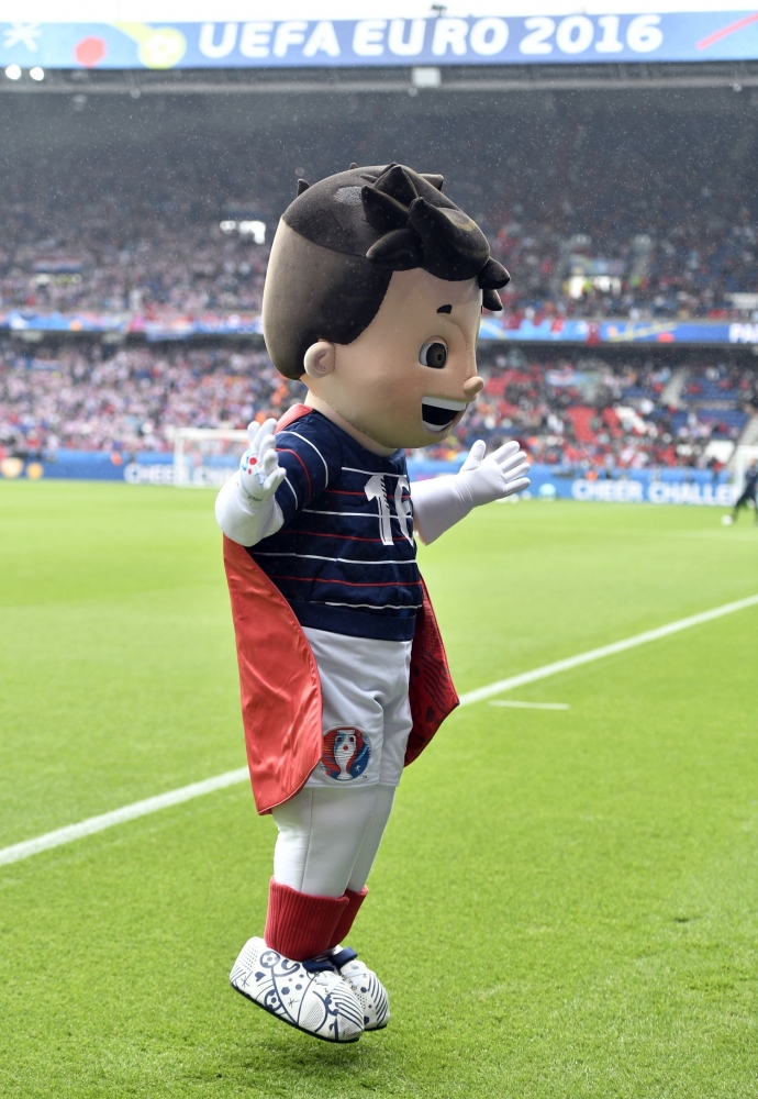 Maskot európskeho šampionátu Super Victor pred zápasom Turecka proti Chorvátsku. Paríž, 12. jún 2016. Foto: SITA/AP