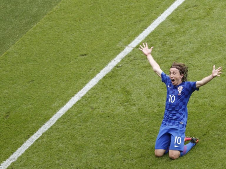 Chorvátsky futbalista Luka Modrič sa raduje z gólu v sieti Turecka počas zápasu na majstrovstvách Európy. Paríž, 12. jún 2016. Foto: SITA/AP