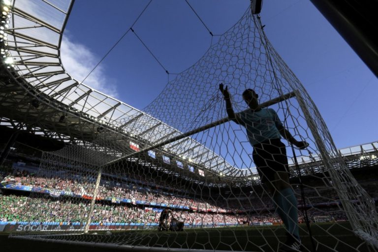 Rozhodca kontroluje bránkovú sieť pred zápasom na majstrovstvách Európy vo futbale medzi Poľskom a Severným Írskom. Nice, 12. jún 2016. Foto: SITA/AP