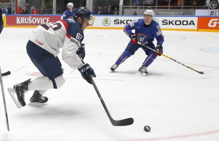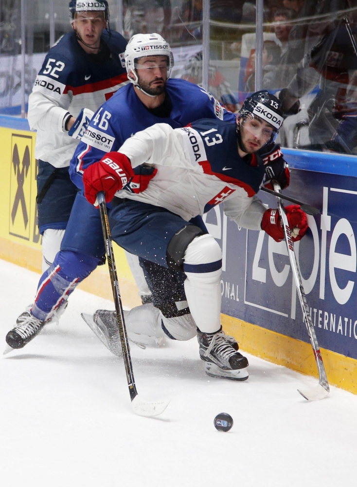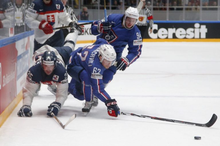 Slovenský útočník Marek Viedenský v súboji s Francúzmi počas zápasu na svetovom šampionáte. Petrohrad, 8. máj 2016. Foto: SITA/AP