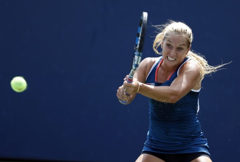 Slovenská tenistka Dominika Cibulková vracia v druhom sete súperke úder. Nad Ruskou Jevgenijou Rodinovou vyhrala 6:7 (5), 6:2, 6:2 za 144 minút, 31. august 2016 New York. Foto: SITA/AP