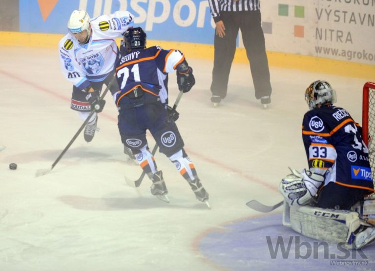 Matej Bene z HK Nitra (vľavo) Eduard šedivý (v strede) a brankár Dominik Riečický (vpravo) z HC Košice počas 3. kola slovenskej hokejovej Tipsport ligy 2015/2016 medzi HK Nitra – HC Košice. Nitra, 15. september 2015. Foto: SITA/Martin Havran