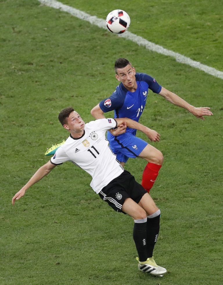 Francúzsky futbalista Laurent Koscielny v súboji s Nemcom Julianom Draxlerom počas semifinálového zápasu na majstrovstvách Európy. Marseille, 7. júl 2016. Foto: SITA/AP