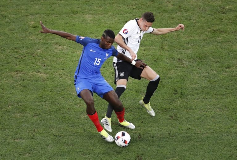 Francúzsky futbalista Paul Pogba v súboji s Nemcom Julianom Draxlerom počas semifinálového zápasu na majstrovstvách Európy. Marseille, 7. júl 2016. Foto: SITA/AP