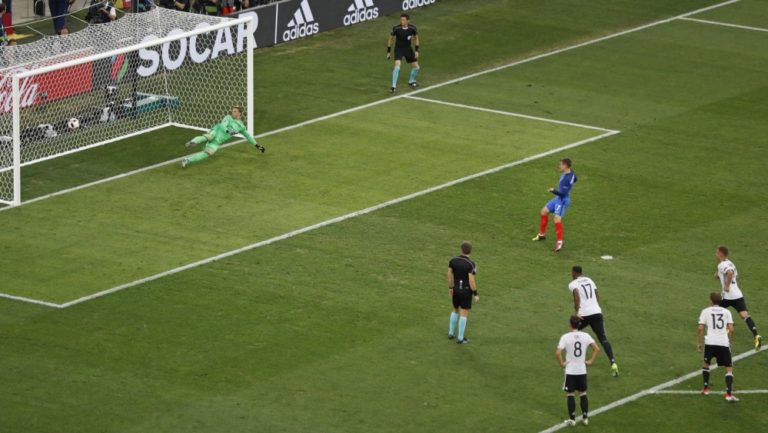 Francúzsky futbalista Antoine Griezmann premieňa pokutový kop počas semifinálového zápasu proti Nemecku na majstrovstvách Európy. Marseille, 7. júl 2016. Foto: SITA/AP