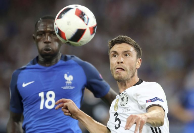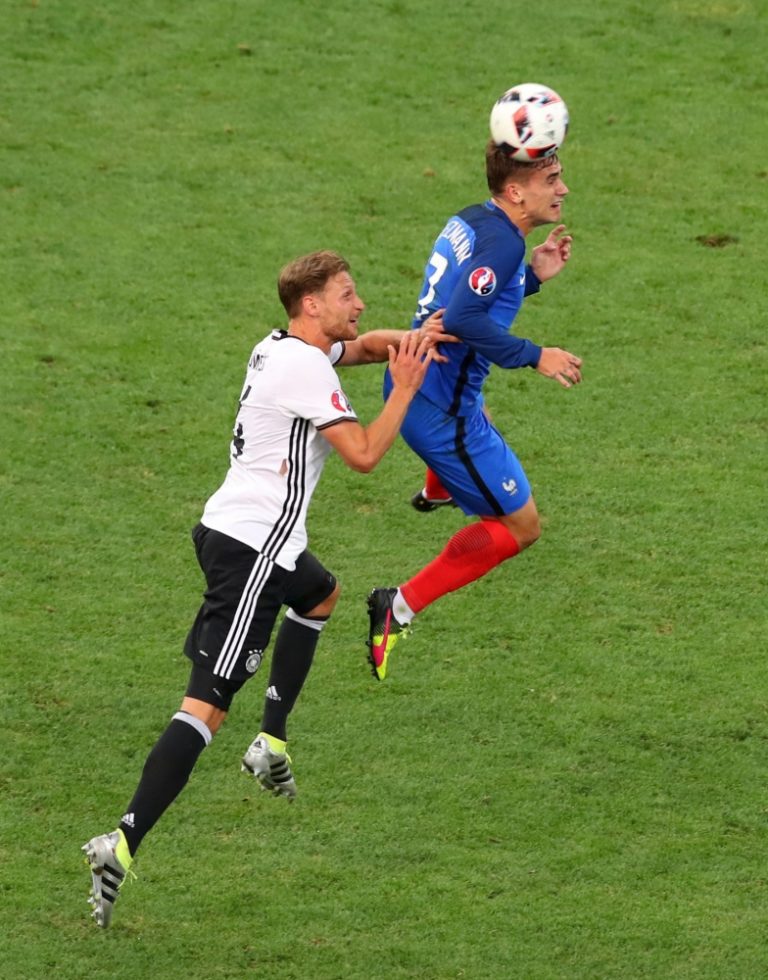 Nemecký futbalista Benedikt Höwedes v súboji s Francúzom Antoinom Griezmannom počas semifinálového zápasu na majstrovstvách Európy. Marseille, 7. júl 2016. Foto: SITA/AP