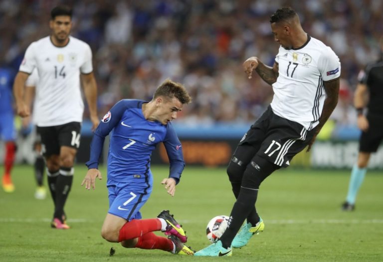 Francúzsky futbalista Antoine Griezmann v súboji s Nemcom Jeromom Boatengom počas semifinálového zápasu na majstrovstvách Európy. Marseille, 7. júl 2016. Foto: SITA/AP