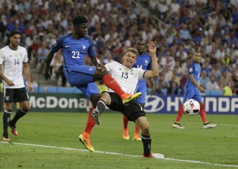 Francúzsky futbalista Samuel Umtiti v súboji s Nemcom Thomasom Müllerom počas semifinálového zápasu na majstrovstvách Európy. Marseille, 7. júl 2016. Foto: SITA/AP