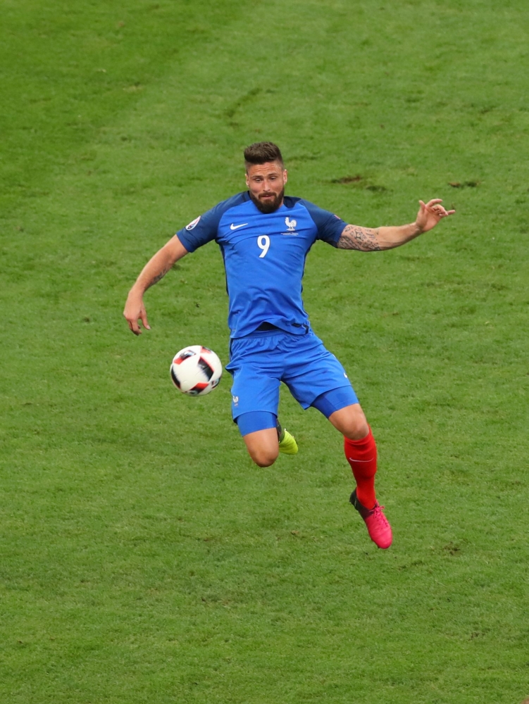 Francúzsky futbalista Olivier Giroud si spracováva loptu počas semifinálového zápasu proti Nemecku na majstrovstvách Európy. Marseille, 7. júl 2016. Foto: SITA/AP