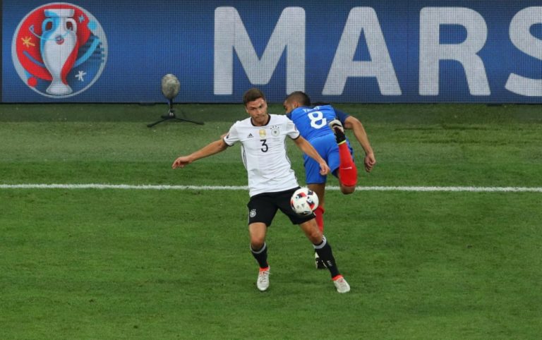 Nemecký obranca Jonas Hector v súboji s Francúzom Dimitrim Payetom počas semifinálového zápasu na majstrovstvách Európy. Marseille, 7. júl 2016. Foto: SITA/AP