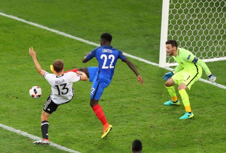 Francúzsky futbalista Samuel Umtiti zablokoval strelu Nemca Thomasa Müllera pred brankárom Hugom Llorisom počas zápasu na majstrovstvách Európy. Marseille, 7. júl 2016. Foto: SITA/AP