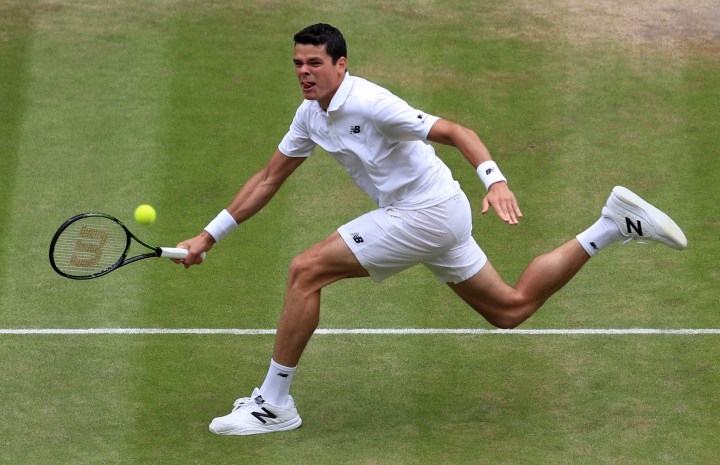 Kanaďan Milos Raonic počas zápasu semifinále Wimbledonu so Švajčiarom Rogerom Federerom. Londýn, 8. júl 2016 Foto: SITA/AP