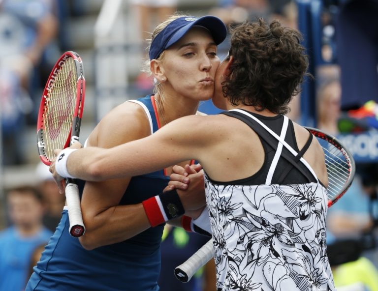 Carla Suárezová-Navarrová a Jelena Vesninová počas sobotňajšieho zápasu 3. kola US Open. New York, 3. september 2016. Foto: SITA/AP
