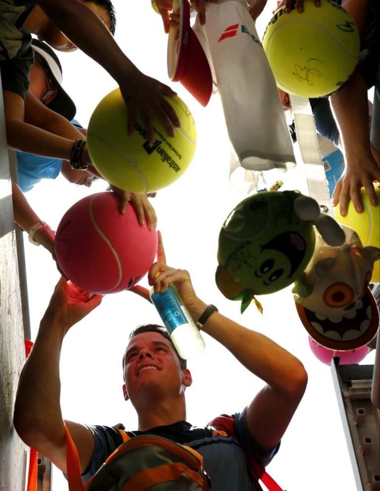 Kanadský tenista Milos Raonic rozdáva autogramy po zápase 2. kola Australian Open, v ktorom zdolal Španiela Tommyho Robreda 7:6 (6), 7:6 (5), 7:5. Melbourne, 21. január 2016. Foto: SITA/AP