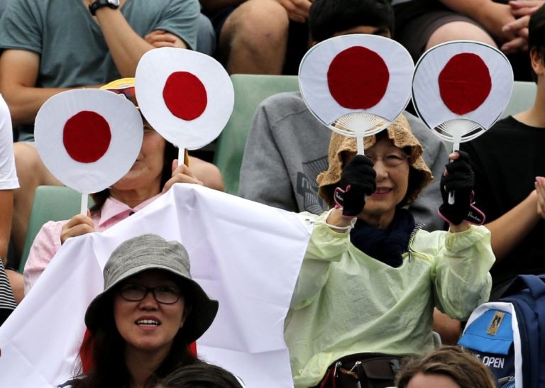 Fanúšikovia z Japonska počas zápasu 2. kola Australian Open, v ktorom Naomi Osaková zdolala Ukrajinku Elinu Svitolinovú dvakrát 6:4. Melbourne, 21. január 2016. Foto: SITA/AP
