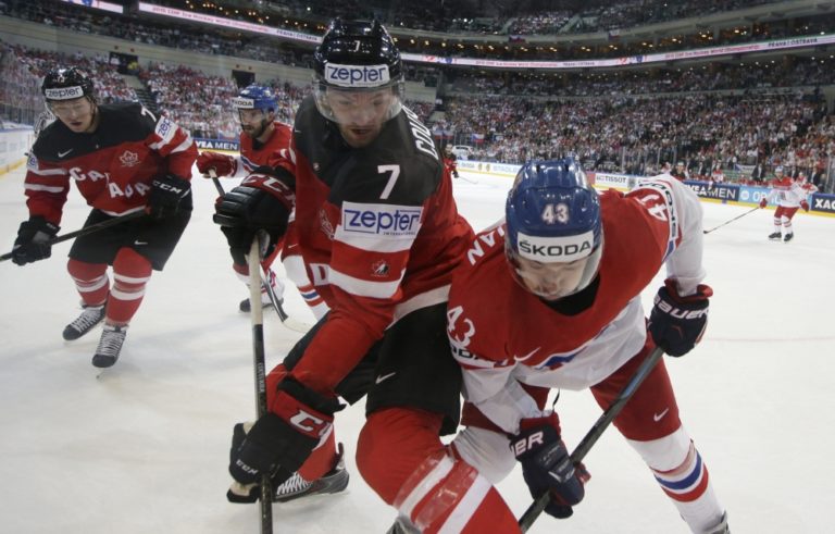 Český útočník Jan Kovář v súboji s Kanaďanom Seanom Couturierom počas zápasu A-skupiny na svetovom šampionáte v Česku. Praha, 4. máj 2015. Foto: SITA/AP
