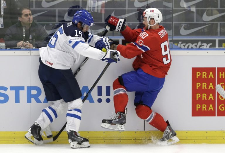 Fínsky útočník Tuomo Ruutu v súboji s Nórom Danielom Sorvikom počas zápasu B-skupiny na svetovom šampionáte v Česku. Ostrava, 4. máj 2015. Foto: SITA/AP