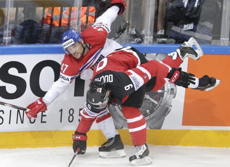 Český obranca Ondřej Němec v súboji s Kanaďanom Taylorom Hallom počas zápasu A-skupiny na svetovom šampionáte v Česku. Praha, 4. máj 2015. Foto: SITA/AP