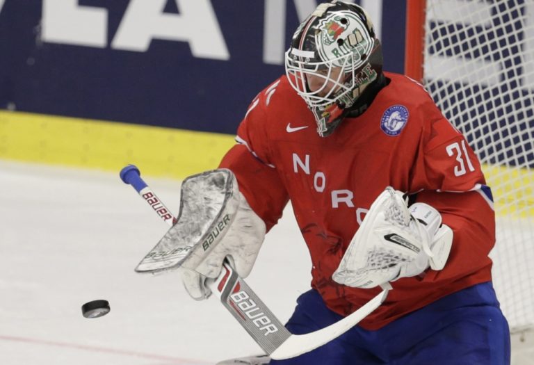 Zákrok nórskeho brankára Larsa Voldena počas zápasu B-skupiny na svetovom šampionáte v Česku. Ostrava, 4. máj 2015. Foto: SITA/AP