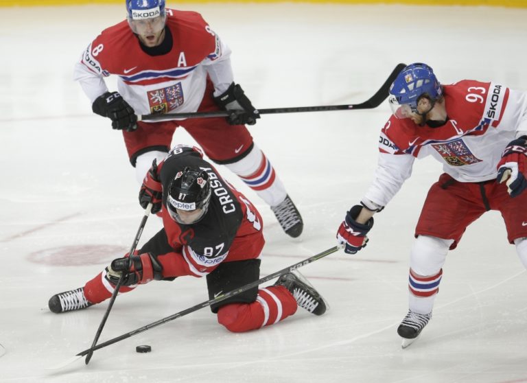 Kanadský útočník Sidney Crosby v súboji s Čechmi Janom Hejdom a Jakubom Voráčkom počas zápasu A-skupiny na svetovom šampionáte v Česku. Praha, 4. máj 2015. Foto: SITA/AP