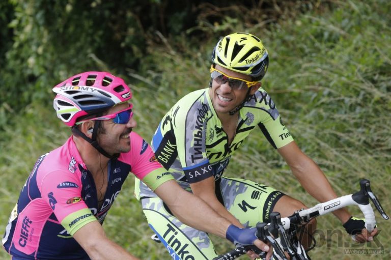 Alberto Contador (vpravo) v rozhovore s Josem Serpom počas štvrtej etapy Tour de France zo Seraing do Cambrai merajúcej 223,5 kilometrov. Foto: SITA/AP
