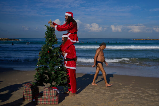 Surferi oblečení ako Santa Claus zdobia vianočný stromček na pláži počas natáčania turistickej reklamy pred Vianocami v Tel Avive. Izrael, 2. decembra 2025. Foto: AP Photo/Ohad Zwigenberg