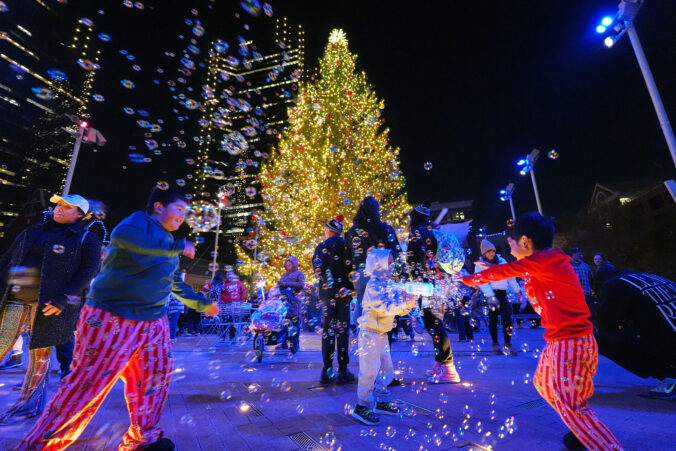 Gabriel Taylor (v strede) sa hrá s ostatnými deťmi so strojom na výrobu bublín po slávnostnom rozsvietení vianočného stromčeka na námestí Sundance Square vo Fort Worth. Texas, 2. decembra 2025. Foto: AP Photo/Tony Gutierrez