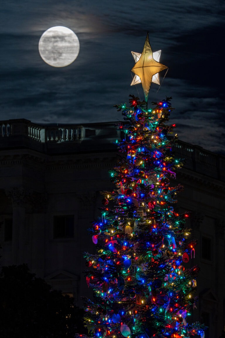 Posledný supermesiac roka, takzvaný studený supermesiac, vychádza za vianočným stromčekom amerického Kapitolu vo Washingtone Spojené štáty, 4. decembra 2025. Foto: AP Photo/Alex Brandon