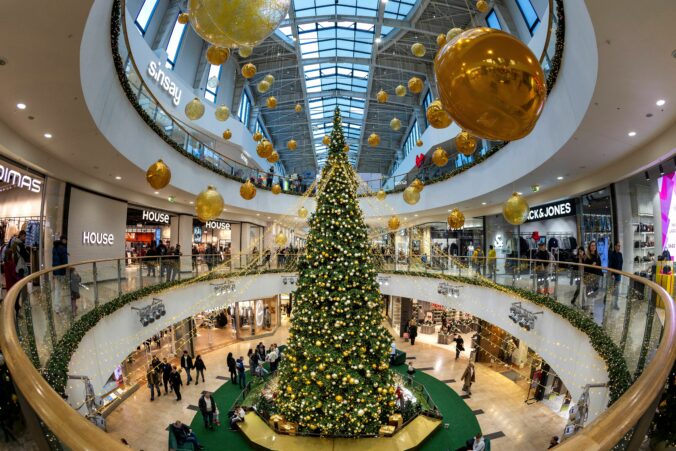 Ľudia prechádzajú okolo obrovského vianočného stromčeka vystaveného na oslavu blížiacich sa sviatkov v nákupnom centre vo Vilniuse. Litva, 22. novembra 2025. Foto: AP Photo/Mindaugas Kulbis
