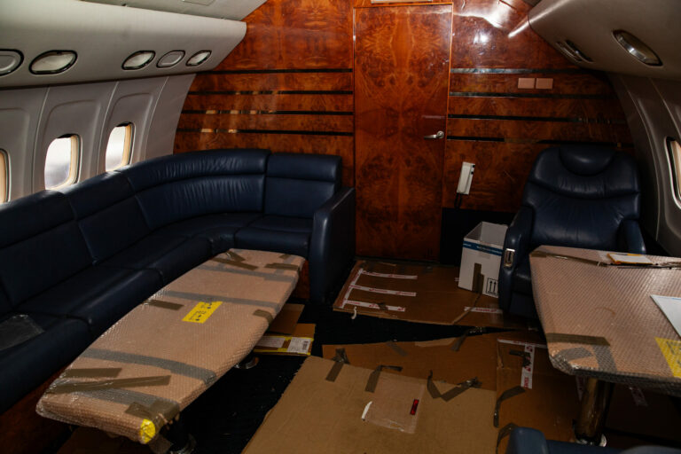 Interiér počas demontáže bývalého vládneho špeciálu Tupolev TU-154M registrácie OM-BYR, ktorého časti naložia na kamióny na dráhe Letiska M. R. Štefánika v Bratislave, odkiaľ bude prevezený do zábavného parku Fantázia v Liptovskom Mikuláši. Bratislava, 11. november 2024. Foto: SITA/Bokor Tomáš