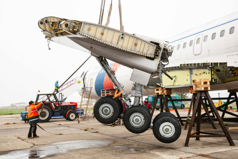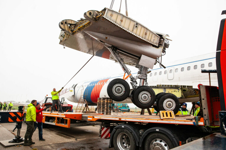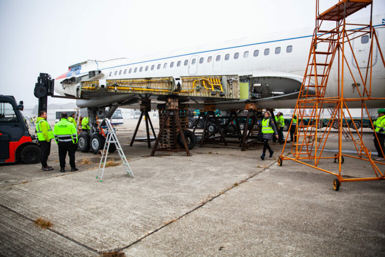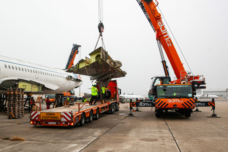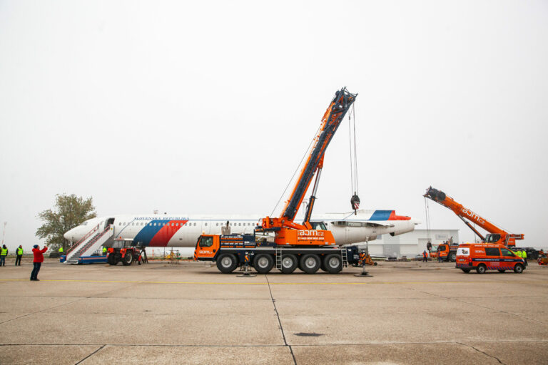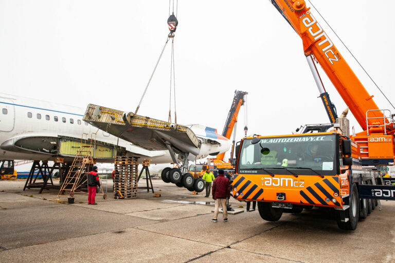 Demontáž bývalého vládneho špeciálu Tupolev TU-154M registrácie OM-BYR, ktrého časti naložia na kamióny na dráhe Letiska M. R. Štefánika v Bratislave, odkiaľ bude prevezený do zábavného parku Fantázia v Liptovskom Mikuláši. Bratislava, 11. november 2024. Foto: SITA/Bokor Tomáš