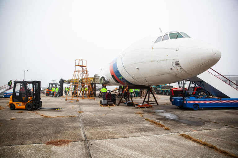 Nakladnie bývalého vládneho špeciálu Tupolev TU-154M registrácie OM-BYR na kamióny na dráhe Letiska M. R. Štefánika v Bratislave, odkiaľ bude prevezené do zábavného parku Fantázia v Liptovskom Mikuláši. Bratislava, 11. november 2024. Foto: SITA/Bokor Tomáš