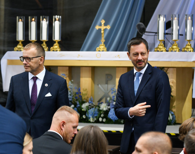 Sprava: Premiér SR Eduard Heger a predseda Národnej rady SR Boris Kollár pred začiatkom slávnostnej svätej omše v Šaštíne-Strážach pri príležitosti Národnej púte k Sedembolestnej Panne Márii, patrónke Slovenska, ktorej sviatok si katolícka cirkev na Slovensku pripomína vždy 15. septembra. Foto: SITA/Martin Medňanský