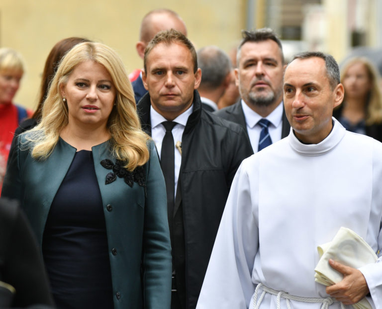 Prezidentka SR Zuzana Čaputová (vľavo) pred začiatkom slávnostnej svätej omše v Šaštíne-Strážach pri príležitosti Národnej púte k Sedembolestnej Panne Márii, patrónke Slovenska, ktorej sviatok si katolícka cirkev na Slovensku pripomína vždy 15. septembra. Foto: SITA/Martin Medňanský