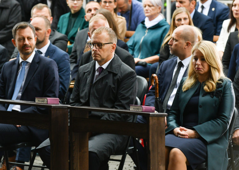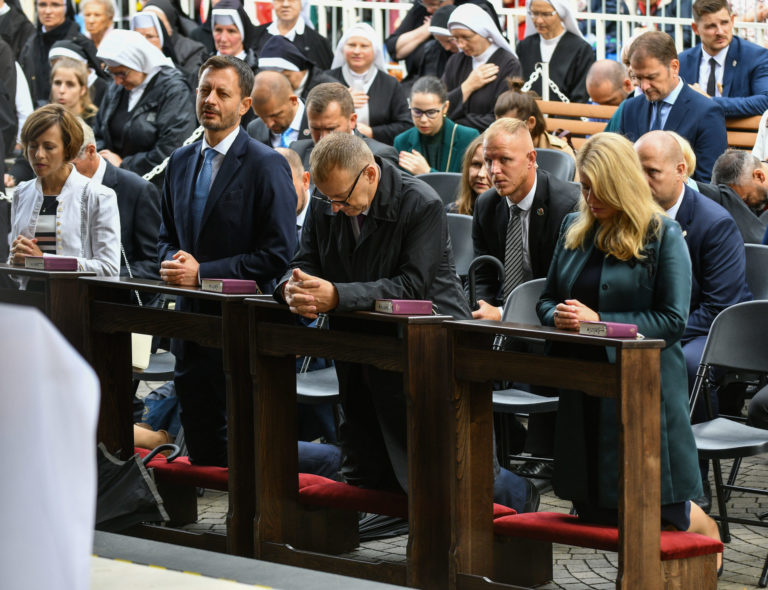 Sprava v popredí: Prezidentka SR Zuzana Čaputová, predseda Národnej rady SR Boris Kollár a premiér SR Eduard Heger počas slávnostnej svätej omše v Šaštíne-Strážach pri príležitosti Národnej púte k Sedembolestnej Panne Márii, patrónke Slovenska, ktorej sviatok si katolícka cirkev na Slovensku pripomína vždy 15. septembra. Foto: SITA/Martin Medňanský