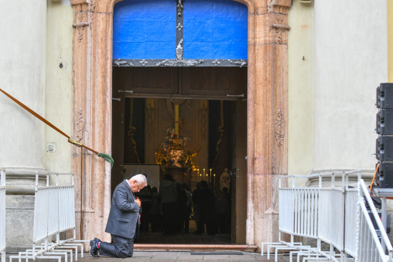 Kňaz pri soche Sedembolestnej Panny Márie počas slávnostnej svätej omše v Šaštíne-Strážach pri príležitosti Národnej púte k Sedembolestnej Panne Márii, patrónke Slovenska, ktorej sviatok si katolícka cirkev na Slovensku pripomína vždy 15. septembra. Foto: SITA/Martin Medňanský
