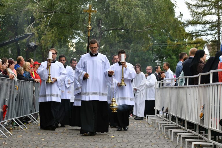 Miništranti počas slávnostnej svätej omše v Šaštíne-Strážach pri príležitosti Národnej púte k Sedembolestnej Panne Márii, patrónke Slovenska, ktorej sviatok si katolícka cirkev na Slovensku pripomína vždy 15. septembra. Foto: SITA/Martin Medňanský