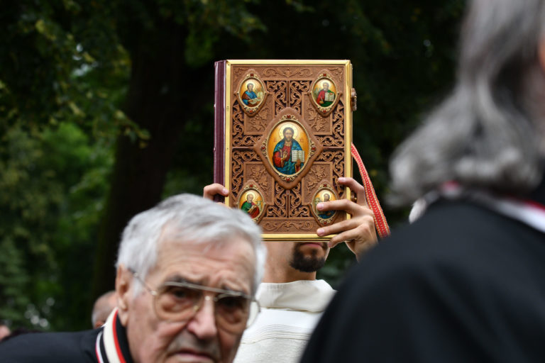 Kňazi a Písmo sväté slávnostnej svätej omše v Šaštíne-Strážach pri príležitosti Národnej púte k Sedembolestnej Panne Márii, patrónke Slovenska, ktorej sviatok si katolícka cirkev na Slovensku pripomína vždy 15. septembra. Foto: SITA/Martin Medňanský