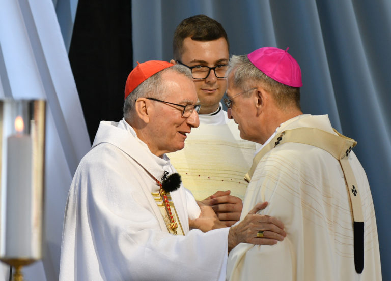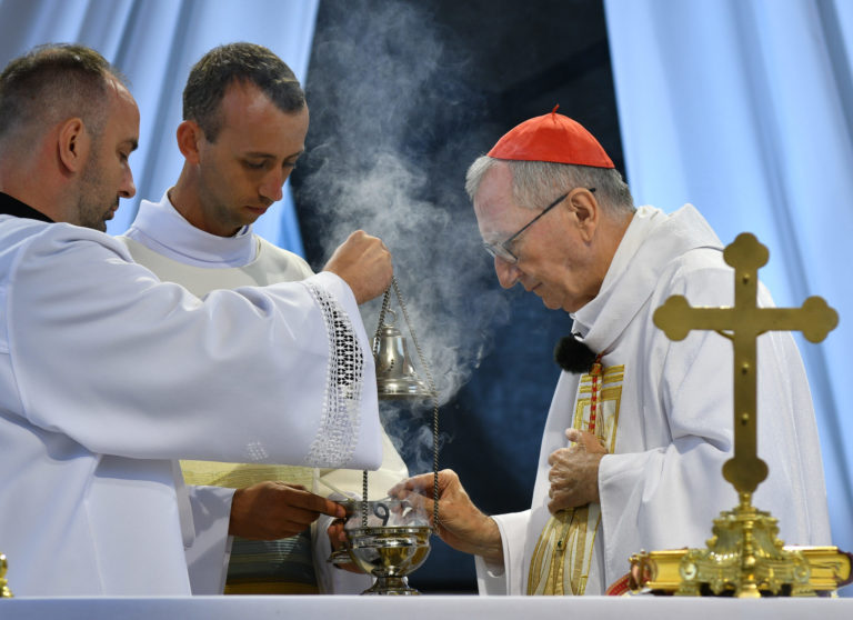 Štátny sekretár Svätej stolice kardinál Pietro Parolin počas slávnostnej svätej omše pri príležitosti Národnej púte k Sedembolestnej Panne Márii, patrónke Slovenska, ktorej sviatok si katolícka cirkev na Slovensku pripomína vždy 15. septembra. Šaštín-Stráže, okr. Senica, 15. september 2023. Foto: SITA/Martin Medňanský.