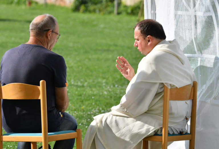 Spovedanie veriacich počas Národnej púte k Sedembolestnej Panne Márii, patrónke Slovenska, ktorej sviatok si katolícka cirkev na Slovensku pripomína vždy 15. septembra. Šaštín-Stráže, okr. Senica, 15. september 2023. Foto: SITA/Martin Medňanský.