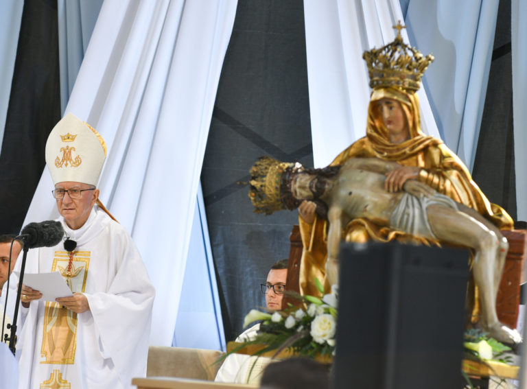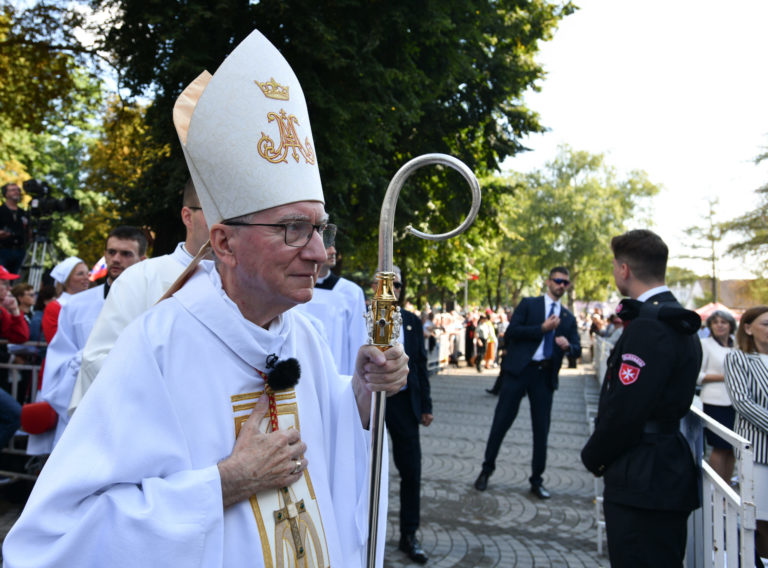 Arcibiskup Róbert Bezák počas slávnostnej svätej omše pri príležitosti Národnej púte k Sedembolestnej Panne Márii, patrónke Slovenska, ktorej sviatok si katolícka cirkev na Slovensku pripomína vždy 15. septembra. Šaštín-Stráže, okr. Senica, 15. september 2023. Foto: SITA/Martin Medňanský.