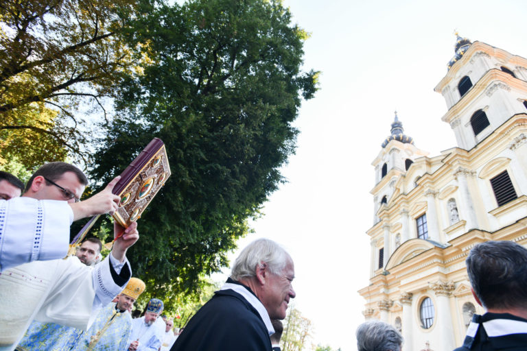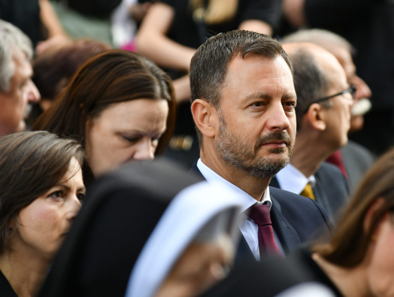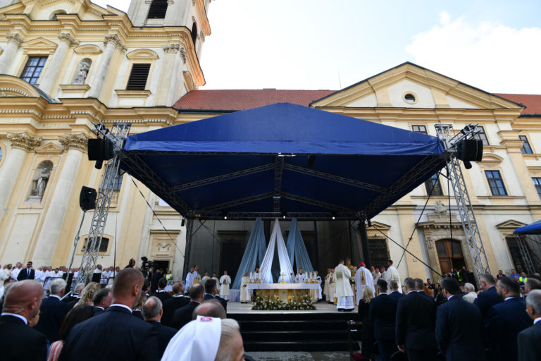 Predseda strany Demokrati Eduard Heger počas slávnostnej svätej omše pri príležitosti Národnej púte k Sedembolestnej Panne Márii, patrónke Slovenska, ktorej sviatok si katolícka cirkev na Slovensku pripomína vždy 15. septembra. Šaštín-Stráže, okr. Senica, 15. september 2023. Foto: SITA/Martin Medňanský.